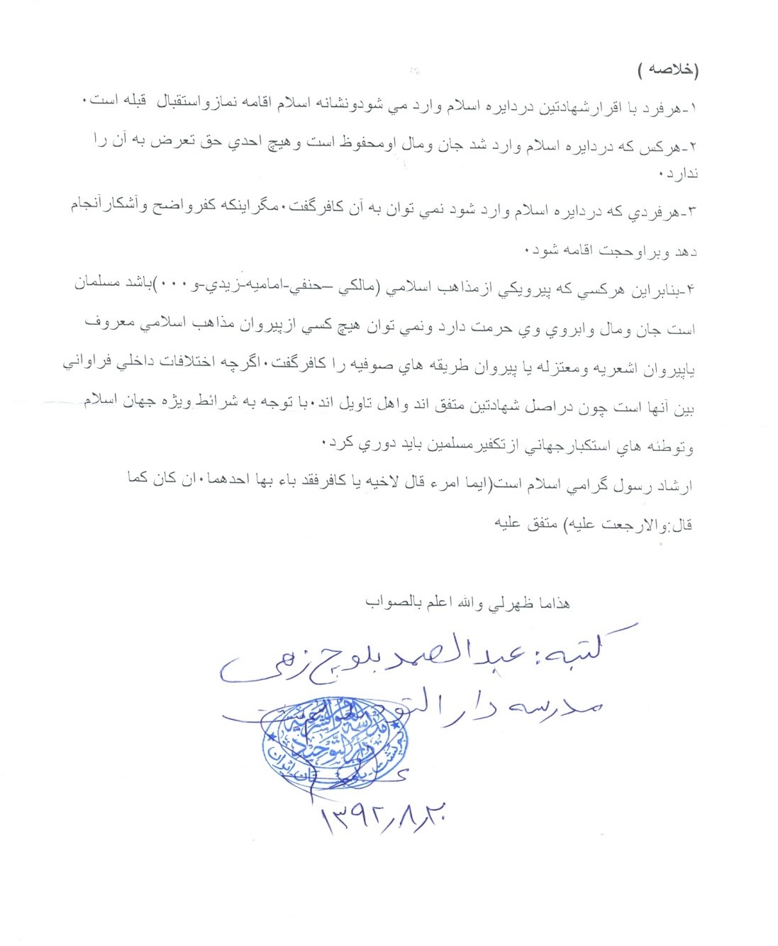 - بنابر این هر کسی پیرو یکی از مذاهب اسلامی (مالکی، حنفی، امامیه، زیدی، و…) باشد مسلمان است جان ومال وآبروی وی حرمت دارد ونمی توان هیچ کسی از پیروان مذاهب اسلامی معروف یا پیروان اشعریه ومعتزله یا پیروان طریقه های صوفیه را کافر گفت. اگر چه اختلافات داخلی فراوانی بین آنها است چون در اصل شهادتین متفق اند و اهل تاویل اند . با توجه به شرایط ویژه جهان اسلام و توطئه های استکبار جهانی از تکفیر مسلمین باید دوری کرد.